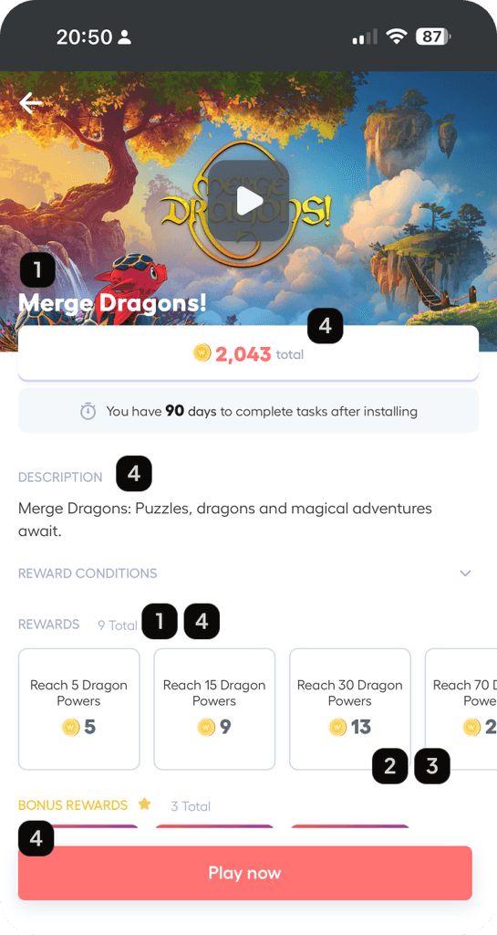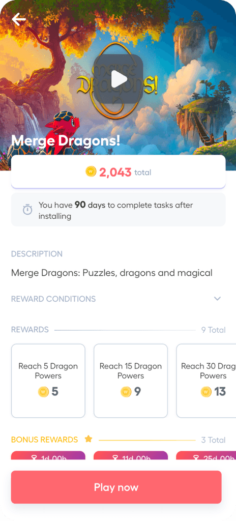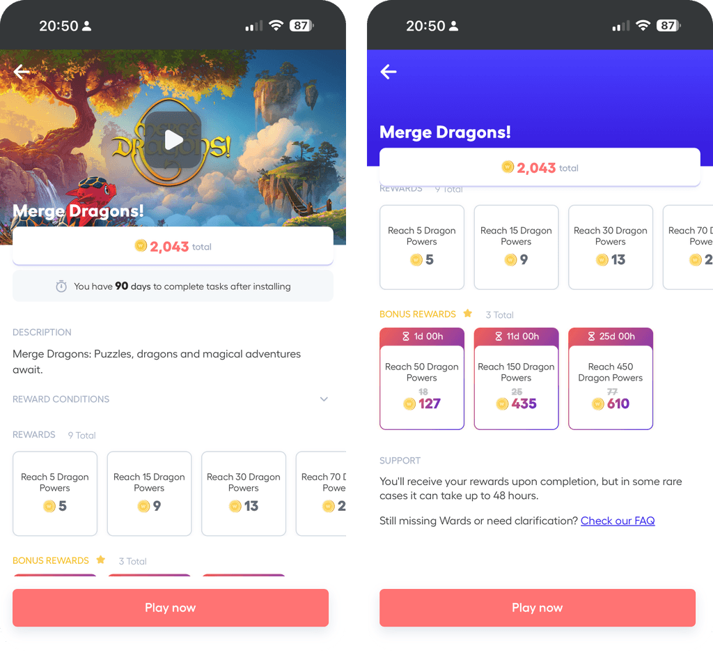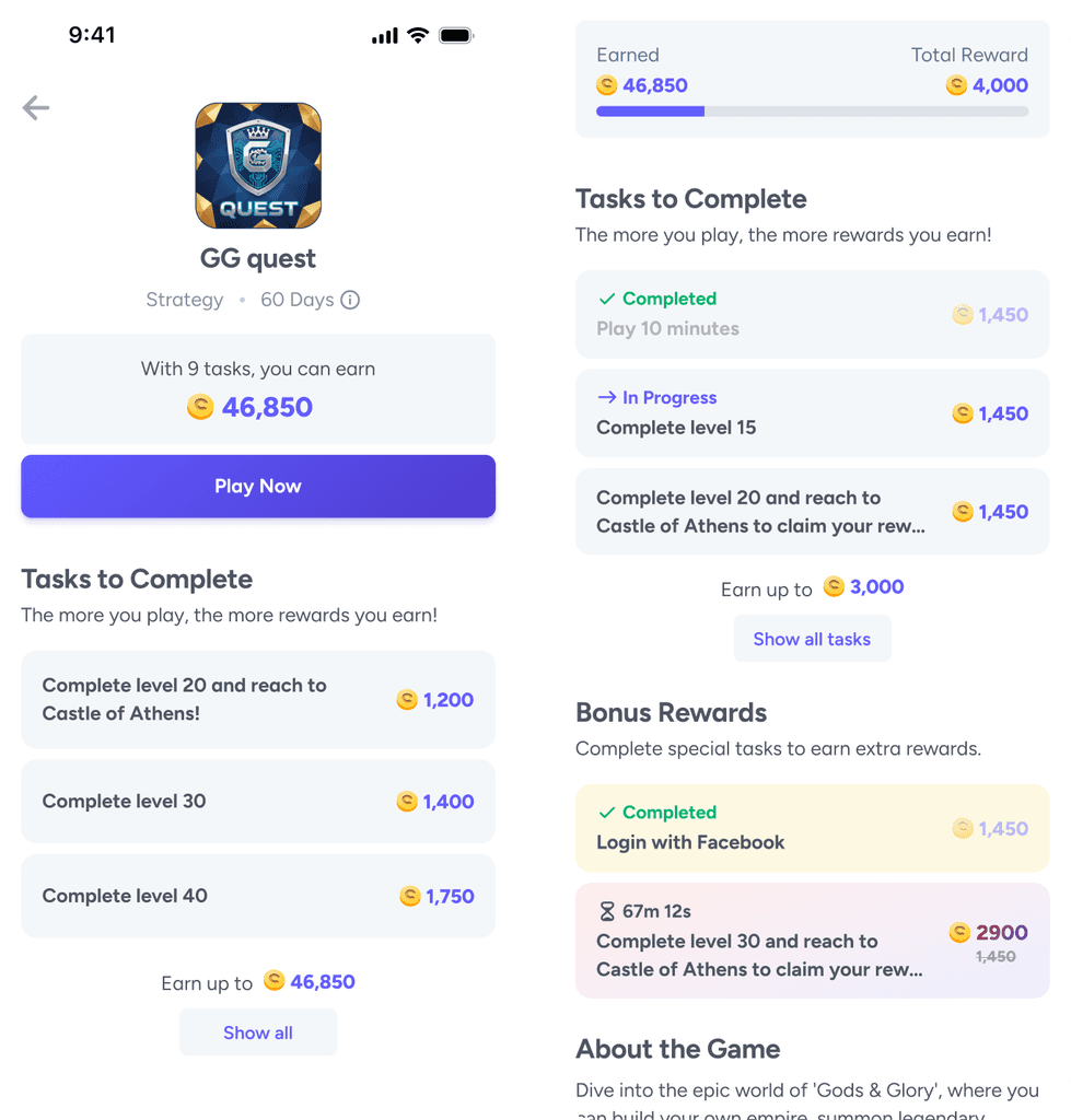 Redesigned Playtime’s offer details page into a clearer, goal-oriented layout that highlights rewards and tasks upfront — improving click-to-install by 8%, revenue by 6%, and giving publishers a more flexible, scalable template.