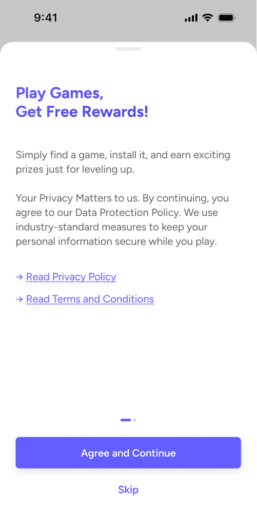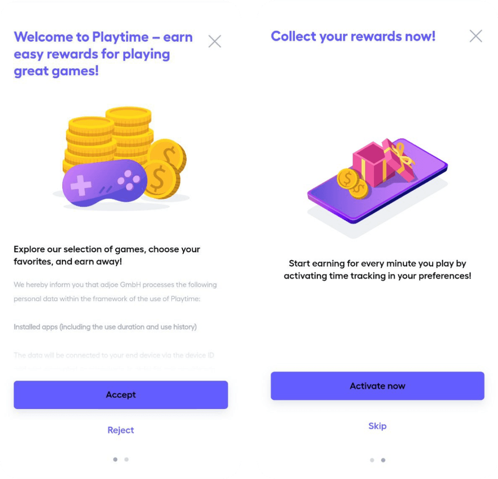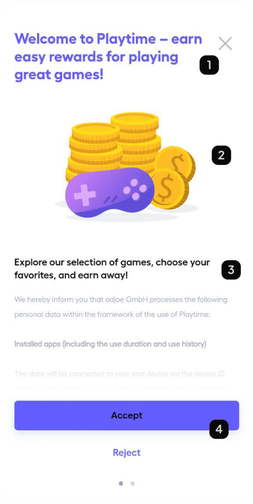 If we highlight what users will gain from Playtime, keep content short, and use delightful and cleaner look, more users will accept ToC and tracking permissions, because they will see the value upfront while feeling reassured that their data is secure and rewards are not scam.