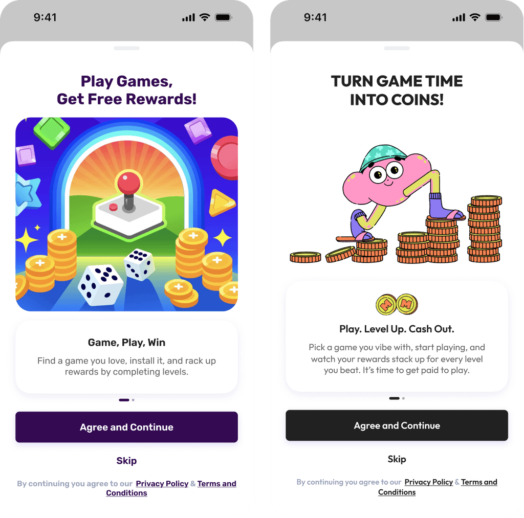 ToC screen reframed with a value proposition (“earn coins by playing games”).
